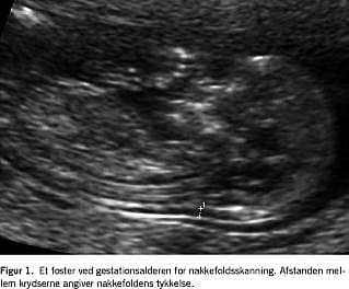 Ved nakkefoldsskanning måles den tynde væskeansamling, alle fostre har under huden i nakkeregionen (Figur 1 ). Det har vist sig, at jo tykkere denne væskebræmme er, desto større er risikoen for, at fosteret har Downs syndrom. Også andre kromosomanomalier og strukturelle misdannelser hos fosteret er associeret med en tyk nakkefold. Nakkefolden alene som screeningsmarkør har en DR på 70% ved en FPR på 5% [24]. Nakkefoldens tykkelse er ligesom serummarkørerne afhængig af fosterets GA, og angives derfor normalt i MoM.