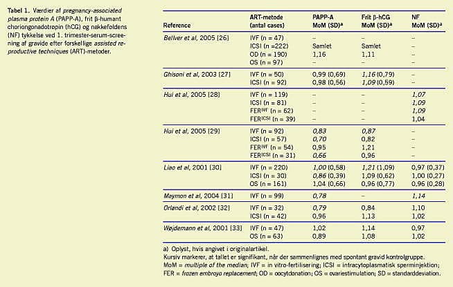 Data for 1. trimester-screening efter ART er sparsomme, og resultaterne er modstridende. Af Tabel 1 fremgår det, at man i flere undersøgelser har fundet en signifikant nedsat PAPP-A-koncentration ved ART-graviditeterne sammenlignet med hos spontant gravide kontrolpersoner [29-32] og en højere koncentration af frit β -hCG [27, 29, 30], hvorimod man i to studier ikke har fundet signifikante forskelle [26, 33]. Derudover er der i to af syv studier påvist en signifikant forskel i nakkefoldstykkelsen [28, 31], således at der er tykkere nakkefold hos fostre ved ART-graviditeter. I ART-graviditeterne ligger FPR på 4,6-10,3% sammenlignet med 3,3-7,1% i kontrolgrupperne [26-28, 30, 32].