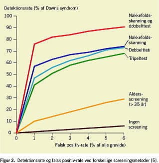 Figur 2 illustrerer forholdet mellem FPR og DR for forskellige screeningsmetoder. Afhængigt af hvor høj en FPR, der kan accepteres, kan DR øges. I Danmark har man besluttet, at FPR for prænatal screening med kombinationen af nakkefoldsskanning og dobbelttest ikke må overstige 5%, og at DR skal ligge omkring 90%. DR og FPR er endvidere afhængige af, hvor man fastsætter sin risikogrænse. En risiko større end 1:250 (ved termin) for at vente et barn med Downs syndrom er i Danmark sat som risikogrænse. Hvis denne grænse ændres f.eks. til 1:400, vil man øge DR, men på bekostning af en højere FPR.