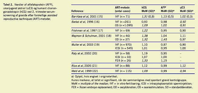 I en oversigtsartikel fra 2002 konkluderede man, at 2. trimester-screening anvendt ved graviditeter opstået efter ART medfører forhøjet FPR og derfor ikke er anvendelig som rutinescreening hos disse kvinder [34]. Dette skyldes primært, at man i flere undersøgelser har fundet signifikant forhøjet hCG-koncentration [15-18, 20, 22] og signifikant nedsat uE3-koncentration [16, 22]. I to studier har man dog ikke fundet nogen forskel i FPR ved ART-graviditeter sammenlignet med ved spontant opnåede graviditeter [19, 21] (Tabel 2 ). I ART-graviditeterne ligger FPR på 18,5-30,4% sammenlignet med 6,6-16,6% i kontrolgrupperne [15-22].