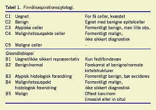 Også i grovnålsdiagnostikken har man valgt at anvende et system med fem diagnostiske kategorier. Der er en vis analogi mellem systemerne, men det er ikke muligt umiddelbart at oversætte de diagnostiske udsagn.