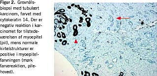 En meget anvendelig gruppe af antistoffer er rettet mod de myoepiteliale celler, som ligger yderst mod basalmembranen i normale gangstrukturer. Påvisning af myoepiteliale celler udelukker invasiv cancer. Antistofferne kan derfor anvendes til at skelne mellem karcinom in situ og invasivt karcinom eller mellem et radialt ar og en tubulær cancer (Figur 2 ). Det er dog vigtigt at erindre, at manglende påvisning af myoepiteliale celler skal fortolkes med stor varsomhed og under hensyntagen til morfologien. Det er derfor også en god ide at anvende to eller flere antistoffer i hvert tilfælde. De mest anvendte antistoffer er rettet mod cytokeratin 14 eller smooth muscle myosin heavy chain (SM-MHC), men også p63- og smooth muscle actin -antistoffer anvendes.