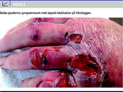 Dette tilfælde af atypisk PG viser, at sygdommen kan opstå dramatisk og akut med smertefulde og hastigt progredierende læsioner og endog med bilateral involvering af håndryggene, hvilket ikke er almindeligt. Idet patienterne ofte er alment medtagede med febrilia, utilpashed, artralgi, myalgi og forhøjede infektionsparametre, må bakteriel infektion udelukkes ved podning, ligesom vaskulitis og insektstik bør udelukkes med relevante supplerende blodprøver og biopsi. Diagnosen stilles ud fra den kliniske undersøgelse sammenholdt med uspecifikke parakliniske fund. Høj SR, leukocytoseniveau og forhøjet CRP er almindeligt. Der kan være anæmi, lav serumjernværdi og hypo- eller hyperglobulinæmi. Histopatologisk ses massiv neutrofil infiltration, blødning og nekrose i epidermis ligesom ved absces eller cellulitis. En subtil differentialdiagnose er morbus Sweet, også kaldet akut febril neutrofil dermatose, der i lokaliseret form på håndrygge kaldes neutrophile dermatosis of the dorsal hands . Denne tilstand kan næppe skelnes fra atypisk PG, og de behandles også ens.