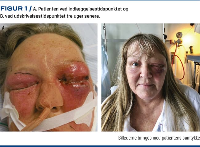 En 55-årig tidligere rask kvinde blev akut indlagt pga. pludselig opstået kraftig hævelse og rødme periorbitalt på venstre side samt almen utilpashed. Hun havde halvanden måned forud for indlæggelse gennemgået en tandrodsbehandling af en kindtand i venstre overmund. Ti dage forud for indlæggelse var hun sat i antibiotisk behandling pga. fortsatte tandsmerter. Ved indlæggelsen blev hun vurderet af bl.a. en kæbekirurg, en øjenlæge og en øre-næse-hals-læge. På mistanke om nekrotiserende fasciitis blev hun intuberet og kørt til nærmeste universitetshospital, hvor mistanken blev afkræftet ved en operation. CT ad flere omgange gennem forløbet viste hverken tegn til absces eller postseptal involvering. Hun var akut påvirket med et C-reaktivt protein niveau over 450 nmol/l og måtte behandles på en intensivafdeling i i alt seks døgn. Ved podning fra øjet blev der fundet Staphylococcus epidermidis og gruppe A-streptokokker samt S. epidermidis i bloddyrkning, hvilket blev relevant behandlet. Efter et par dages fremgang sås en forværring i smerter samt rødme og hævelse omkring øjet, hvorfor der blev skiftet fra intravenøst givet penicillin til cefuroxim og metronidazol. Herefter aftog hævelsen, mens infektionstallet faldt under indlæggelse på øjenafdelingen. Patienten kunne ikke åbne øjet spontant, og øjenbevægelserne var diskret indskrænket med let diplopi. Visus var normalt, og der var hverken proptose eller smerter i øjet. Efter 14 dages indlæggelse blev hun endnu en gang vurderet i kæbekirurgisk regi, da hun fortsat klagede over ømhed i den rodbehandlede tand og alment ubehag. Efter tre ugers indlæggelse blev tanden fjernet, til trods for at der ikke var entydige infektionstegn. Dagen efter var infektionstallet normaliseret, og alt antibiotika blev forsøgt seponeret. To døgn senere kunne hun spontant åbne øjet nogle millimeter og følte almen bedring, hvorfor hun blev udskrevet til ambulant opfølgning. Tre uger efter udskrivelsen gik det fortsat fremad med aftagende hævelse og fortsat normale infektionstal.