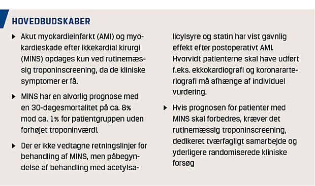 Myocardial injury after non-cardiac surgery (MINS) is asso­ciated with significant morbidity and mortality. Routine troponin screening is necessary to identify patients with MINS. Although some evidence indicates benefit with aspirin and statin therapy in these patients, a number of clinical considerations must be done in the practical management of MINS. This article describes current experience with iden­tification and treatment in Denmark of patients with MINS.