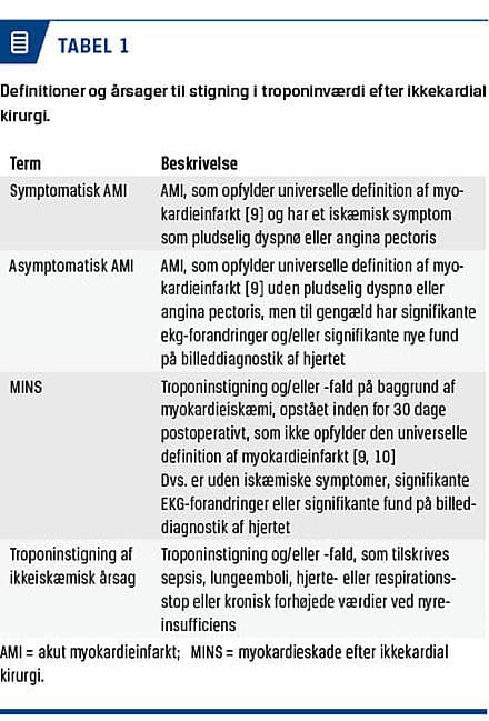 Myokardieskade efter ikkekardial kirurgi (myocardial injury after non-cardiac surgery (MINS) er en ny og klinisk væsentlig diagnose, og tilstanden er karakteriseret ved asymptomatisk iskæmisk skade på myokardiet efter operation [10]. MINS diagnosticeres ved en signifikant stigning og/eller fald af troponinværdi uden ekstrakardial årsag (Tabel 1) og er således en eksklusionsdiagnose. MINS er forbundet med betydelig øget risiko for alvorlige kardiale komplikationer og mortalitet. Selv meget små postoperative troponinudslip, som kan måles med nye højsensitive troponinanalyser, er forbundet med en firefold øget risiko for død i forhold til patienter, som har en troponinværdi under detektionsgrænsen (4% vs. 1% 30-dagesmortalitet) [3]. Sammenhængen mellem størrelsen af et troponinudslip og 30-dagesmortalitet forekommer lineær; således er mortaliteten en ud af seks ved peak-troponinkoncentration ≥ 300 ng/l [3, 11]. I et nyligt publiceret, stort, dansk studie har man påvist sammenlignelig treårsdødelighed (ca. 60%) ved type 2-AMI og myokardieskade i en blandet population af indlagte patienter [12].