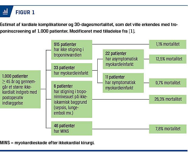 To ud af tre tilfælde af postoperativt AMI er uden iskæmiske symptomer. Disse tilfælde påvises kun ved rutinemæssig troponinscreening. Postoperativt AMI og MINS opstår oftest inden for 48 timer efter kirurgi, og det er derfor muligt at screene ved måling af troponinkoncentrationen på første og anden postoperative dag. Ca. 8% af alle patienter, som er over 45 år og gennemgår et større ikkekardialt indgreb, vil få AMI eller MINS (Figur 1). Forekomsten af kardiale komplikationer er signifikant øget [2]. Postoperativt hjertesvigt forekommer hos 24,3%, 15,5% og 3,2% af patienter med henholdsvis symptomatisk AMI, asymptomatisk AMI og MINS samt hos 2,2% af de patienter, som ikke har troponinudslip. Tallene for nonfatalt hjertestop er hhv. 2,1%, 4,1%, 0,9% og 0,3% [2].