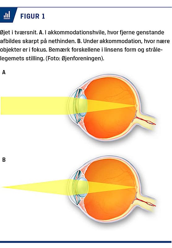 Den fremherskende teori om akkommodationsmekanismen forudsætter, at den unge linse er deformerbar, elastisk og udspændt af zonulatrådene, som forbinder linsen med strålelegemet [2] (Figur 1A). Når strålelegemets ringmuskel, musculus ciliaris, er afslappet, er zonulatrådene udspændte og linsen fladest mulig på grund af disse trådes træk langs linsens ækvator. Det hvilende emmetrope øje vil i den tilstand afbilde fjerne genstande skarpt på nethinden. Under musklens sammentrækning slækkes zonulatrådenes træk på linsen og i det unge øje, hvis linse er blød og elastisk, vil linsen antage en rundere og stærkere brydende form, hvilket bringer genstande tættere på øjet i fokus på nethinden (Figur 1B).