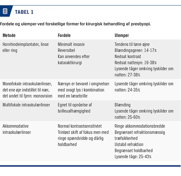 Kirurgisk behandling bygger på de samme principper som kontaktlinseløsningerne. Man kan ændre hornhindens form, implantere en supplerende linse i øjet eller erstatte øjets naturlige linse med et implantat (Tabel 1). Den højeste tilfredshed opnås, når presbyopien er fuldt udviklet [8].