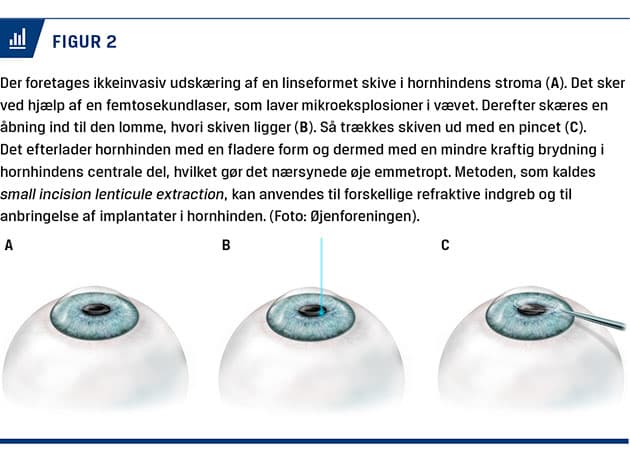 Også ved hornhindekirurgi kan man anvende monovision, hvor man indstiller det ene presbyope øje til at se fjernt og det andet til at se nært. Justering af øjets brydning kan f.eks. ske ved at udskære en linseformet skive inde i hornhinden med en ikkeinvasiv femtosekundlaser. Efter ekstraktion af skiven står hornhinden tilbage med en ændret overfladekontur (Figur 2) [10]. Operationen er irreversibel. Man kan også gennem en laserkirurgisk ændring af hornhindens form inducere sfærisk aberration, så øjet ser lidt mindre skarpt, men over et større afstandsinterval. Det kan kombineres med monovision, så det ene øje indstilles til at dække fra fjern- til mellemafstand og det andet øje fra mellemafstand