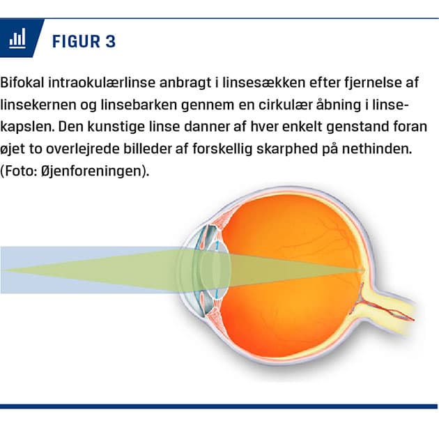 Implantatlinser med mere end ét fokus er attraktive for patienter, som prioriterer frihed for briller og kontaktlinser over hensynet til optisk skarphed (Figur 3). Blandt patienter med multifokale intraokulærlinser med presbyopikompensation bliver op mod 93% tilfredse [14, 15], selvom de får mindre skarphed og kontrast end med monofokale linser [16]. Om natten, hvor pupillen er stor, ser en fjerdedel til halvdelen af patienterne lysende rande omkring lyskilder [16, 17].