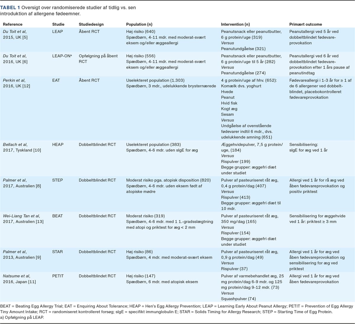 Formålet med denne artikel er at gennemgå evidensen fra de nyeste randomiserede studier af tidlig introduktion af fødevarer i småbørns kost, særligt peanut og æg, med fokus på, om fundene er overførbare til en dansk population. Disse studier omfatter et med peanut [5, 6], fem med æg [7-11] og et med flere fødevarer [12] (Tabel 1).