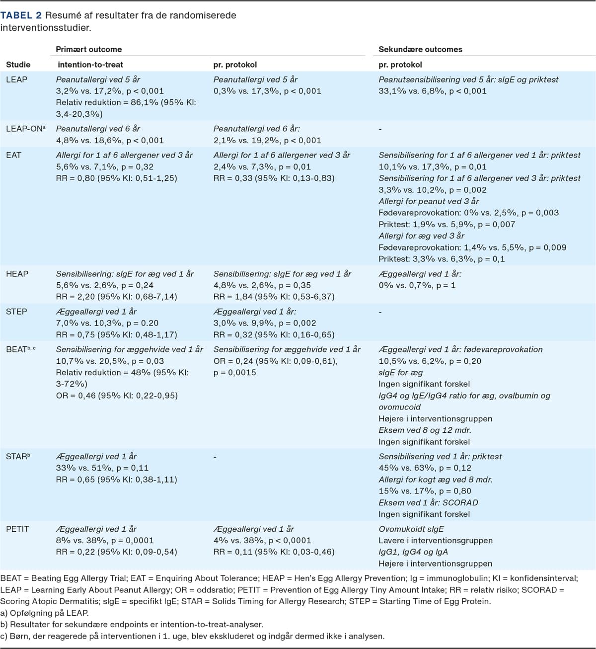 Disse interventionsstudier viser, at konceptet med tidlig introduktion af fødevarer i småbørns kost til forebyggelse af fødevareallergi kan påvirke incidensen af allergi for peanut og æg, men at responset er allergenspecifikt [15] og afhænger af processering, mængde, alder ved introduktion, samtidig amning, kostvaner, generel eksponering samt population. Studierne viser dog også, at det er svært at ændre spædbørns kost, da f.eks. halvdelen af æggepulverdoserne blev glemt i mere end to måneder i STEP, og det kun var 42% i EAT, der fulgte pr. protokol-introduktionen for alle seks fødevarer [16].