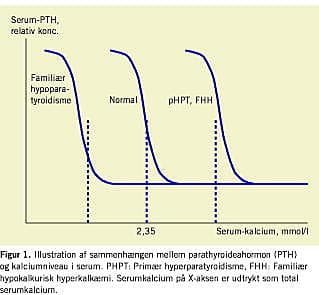 Ved tilfældigt påvist hyperkalkæmi vil årsagen være primær hyperparatyroidisme (PHPT) eller malign hyperkalkæmi i mere end 90% af tilfældene, dog således at den maligne hyperkalkæmi vil være den hyppigst forekommende årsag i hospitalsregi og PHPT i primærsektoren [1]. Ved indførelse af automatiserede analysemetoder i begyndelsen af 1970'erne steg incidensen af PHPT i USA markant, men den var tilsyneladende tilbage på udgangsniveauet ved årtusindskiftet [1]. Også i Skandinavien er PHPT ligeledes en meget almindelig endokrin lidelse med en prævalens på 2,1% hos postmenopausale svenske kvinder [2] og en incidens i Danmark på ca. seks pr. 100.000 pr. år for kvinder og ca. to pr. 100.000 pr. år for mænd [3]. Ved PHPT foreligger der ligevægtshyperkalkæmi, der oftest er stabil over år [4]. PHPT er forårsaget af overproduktion af parathyroideahormon (PTH). Sygdommen skyldes et benignt, solitært adenom i 80-85% af tilfældene, hyperplasi af flere kirtler i 15-20%, mens malignitet som primær årsag er sjælden [5]. Ved grænsetilfælde og milde tilfælde findes klinisk let hyperkalkæmi med samtidig upassende højt normal- eller let forhøjet serum-PTH. I forbindelse med udviklingen af mere udtalt hyperparatyroidisme forskydes den omvendt S-formede kurvesammenhæng mellem serum-kalcium og serum-PTH opad og mod højre - kalcium-set-point stiger (Figur 1 ) [6, 7]. I disse tilfælde med et øget set-point ses en asymptotisk vækst af et eller flere parathyroidea-adenomer med en initial hurtig vækst fulgt af en stabil fase.