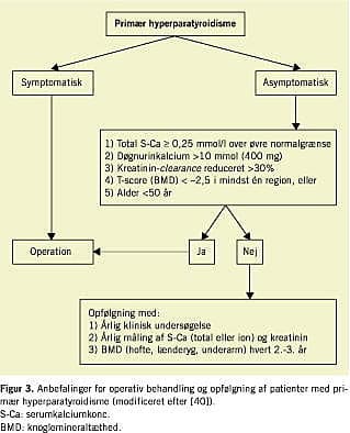 Den eneste etablerede kurative behandling for PHPT er operation, der på centre med erfarne operatører har en succesrate på 95-98% med beskeden morbiditet og ingen mortalitet. Patienter med symptomatisk PHPT bør som hovedregel opereres, hvis der ikke foreligger tungtvejende kontraindikationer mod operation. Siden man på en NIH konference i 1990 [39] fastsatte anbefalinger for behandling af let asymptomatisk PHPT, er der sket en udvikling mod mere kirurgisk aktivitet. Man har således for nylig revideret behandlingsanbefalingerne [40], hvor man primært har sænket interventionsniveauet for serum calcium (Figur 3 ).