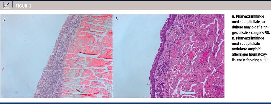Histologisk fandt man subepiteliel infiltration med lymfocytter og polyklonale plasmaceller. Tumoren var opbygget af nodulært arrangeret acellulært eosinofilt amorft materiale, som var positivt for amyloidspecialfarvninger (Figur 1A og B), og diagnosen LA blev stillet.
