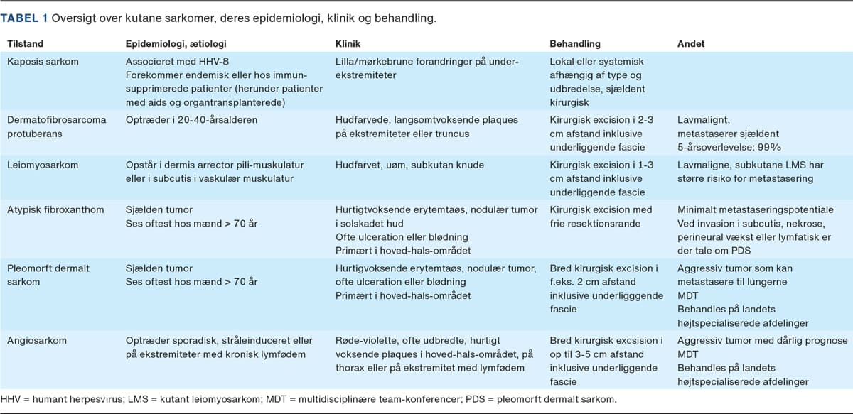 Kutane sarkomer er en sjælden undergruppe af maligne bløddelstumorer, som opstår primært i dermis eller subcutis. De klassificeres efter det bløddelsvæv de opstår i. Vaskulære sarkomer opstår i hudens kar (Kaposis sarkom (KS) og angiosarkom (AS)), kutane leiomyosarkomer opstår i hudens glatte muskulatur, og fibrohistiocytære sarkomer opstår i hudens bindevæv (dermatofibrosarcoma protuberans, atypisk fibroxanthom og pleomorft dermalt sarkom) (Tabel 1).