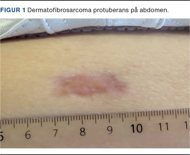 DFSP ses hyppigst på truncus og ekstremiteterne, sjældnere i hoved-hals-regionen [7]. Anamnestisk beskrives læsionen ofte som en langsomtvoksende, asymptomatisk læsion, som er startet som en fortykkelse af huden og som ofte har været til stede i årevis [8]. Objektivt findes et fast, multinodulært plaque, som er hudfarvet og frit mobilt over det underliggende væv (Figur 1). Diagnosen stilles optimalt ved incisions- eller excisionsbiopsi [4, 9]. Da sygdommen primært forekommer som en lokaliseret læsion, er billeddiagnostiske undersøgelser sjældent indicerede, men ved de store tumorer kan UL- eller MR-skanning bruges for at vurdere tumorens omfang. Ved recidiv, fibrosarkomatøs transformation eller mistanke om spredning anbefales UL-skanning af lymfeknuder, CT eller MR-skanning samt kontrol-CT eller PET-CT mhp. detektion af lungemetastaser [9, 10].