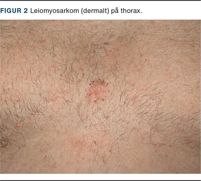 Tumorerne findes hyppigst på ekstremiteterne og viser sig som faste, hudfarvede eller rød-brune subkutane knuder (Figur 2). De er uømme og har ofte udviklet sig over måneder til år [13]. Diagnosen stilles ved biopsi, hvor noget subkutant væv er repræsenteret, og lungerne anbefales undersøgt billeddiagnostisk. Ved store dermale LMS og de subkutane tumorer anbefales præoperativ MR-skanning af området for at kortlægge læsionen [14, 15].