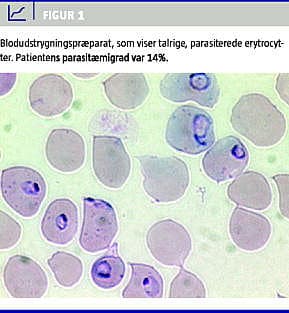 II. + III. En uge senere blev en syvårig dreng indlagt med feber, opkastninger, appetitløshed, myalgier og hovedpine. Han havde i Uganda fået diagnosticeret malaria og var blevet sat i kininbehandling, men havde ikke nået at færdiggøre kuren før afrejse til Danmark. Hans fireårige søster havde hovedpine, var småtspisende og utilpas, men fremstod klinisk upåvirket og var afebril. Blodprøver viste for begge børn anæmi, marginal trombocytopeni og forhøjet C-reaktivt protein. Mikroskopi viste P. falciparum ; drengen havde 5% parasitæmi, mens den afebrile søster havde 14% (Figur 1 ). Begge børn blev behandlet med intravenøs kinin i to døgn, hvorunder parasitgraden faldt, og behandlingen kunne færdiggøres med peroral atovaquon og proguanil.