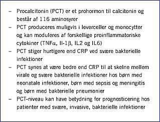 Procalcitonin (PCT) blev første gang beskrevet som en markør for bakteriel sepsis hos børn i 1993 [2], da man fandt, at børn med svære bakterielle infektioner havde meget høje PCT-koncentrationer i serum, mens koncentrationen var meget lav hos børn uden invasiv infektion. Siden har man i mange studier undersøgt PCT som markør for invasiv bakteriel infektion og sammenlignet den med andre »infektionsmarkører« [3-6].