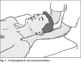 Flytning af patienter, som formodes at have ustabil halscolumnafraktur, fra et leje til et andet kræver deltagelse af flere personer. En person står ved hovedgærdet og holder hovedet i kroppens længderetning, mens de øvrige personer trækker patienten over på det andet leje, eller løfter patienten en bloc. Proceduren skal være aftalt på forhånd, og personen, der holder hovedet, styrer forflytningen. En god måde til at sikre, at hovedet ikke bevæger sig i forhold til kroppen, er at holde fast i patientens skuldre på begge sider, og lade patientens hoved hvile på underarmene (Fig. 1 ). Forflytningen foregår mest hensigtsmæssigt ved brug af en glidemadras. Ved behov for at vende patienten på siden sikres hovedets position ved et solidt greb om patientens baghoved.