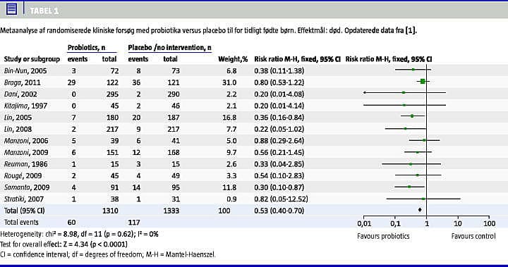 I Danmark bliver ca. 7% af alle børn født for tidligt, det vil sige fødsel før fulde 37 svangerskabsuger [4]. Behandlingen af for tidligt fødte børn er forbedret markant, siden man påbegyndte brugen af antenatal steroider ved truende for tidlig fødsel, behandling med surfaktant og med introduktionen af neonatale intensivafsnit i begyndelsen af 1980'erne [5, 6]. I dag udvikler langt de fleste for tidligt fødte børn sig normalt, men ikke overraskende er der fortsat en betydelig dødelighed (20%) blandt de meget og ekstremt for tidligt fødte børn, dvs. børn født før 32 svangerskabsuger [7]. En frygtet komplikation er nekrotiserende enterokolitis (NEC), som er en livstruende tilstand, der kan medføre malabsorption, korttarmssyndrom, strengileus og stenose. Årsagen til NEC er multifaktoriel [8, 9]. Der foregår intensiv forskning for at prædiktere og forebygge NEC. Man ved, at præmaturitet disponerer til NEC, og at mælk fra moderen nedsætter risikoen for NEC. Mikrofloraen har også en vigtig betydning i udviklingen af NEC. Derfor kunne probiotika i teorien have en sundhedsfremmende effekt ved i tarmen at skabe en mikrobiel sammensætning, som modulerer den immunologiske kaskade og derved nedsætter udviklingen af NEC. For nylig påviste man i to uafhængige metaanalyser af randomiserede kliniske forsøg, at probiotika mere end halverede både risikoen for udvikling af NEC og dødeligheden [1, 2]. Denne overvældende effekt kræver et nærmere »eftersyn«, og i det følgende vil metaanalyserne bliver kritisk vurderet.