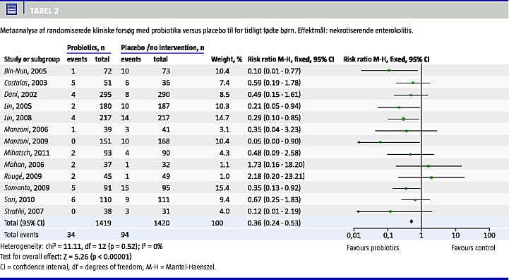Metaanalysen med 16 forsøg og næsten 3.000 børn, der var født før 34 svangerskabsuger, viste en beskyttende effekt af probiotika på henholdsvis død (relativ risiko (RR): 0,53; 95% konfidens-interval (KI): 0,40-0,70, p < 0,0001) og NEC (RR: 0,36; 95% KI: 0,24-0,53, p < 0,00001) (Tabel 1 og Tabel 2 ) [1]. Gennemgår man de enkelte inkluderede, randomiserede studier har man i de fleste benyttet en adækvat metode til randomisering, blinding og opfølgning af data. Det vil sige, at risikoen for systematiske fejl (bias) er forsøgt relevant begrænset. Desuden indikerer funnel-plot -analysen ingen tegn på bias eller publikationsbias [1]. Metaanalysen af profylaktisk behandling med probiotika er flere gange blevet opdateret, hvilket øger risikoen for tilfældige fund, det vil sige et falsk positivt fund på grund af gentagne statistiske testninger. En justeret metaanalyse af antal tidligere statistiske test (trial sequential analysis ), som også benyttes ved interimanalyser i et enkelt forsøg, viste dog fortsat en signifikant p-værdi [10]. Ovenstående indikerer altså en relativt robust metaanalyse.