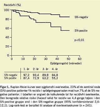 Den gennemsnitlige opfølgningstid var 21 måneder (spændvidde 1-51 måneder): 75% af patienterne blev fulgt i mere end 13 måneder, og 25% blev fulgt i mere end 34 måneder (Tabel 2). To patienter fandtes i forbindelse med SNB at have dissemineret sygdom med lever- og lungemetastaser og døde efter henholdsvis fem og syv måneder. I observationsperioden efter SNB udvikledes der hos 7% af de SN-negative patienter et recidiv, mens 23% af de SN-positive patienter fik recidiv (p < 0,01) (Tabel 2 og Figur 1). En af de fire patienter med suspekte celler i den udtagne SN fik også recidiv i form af en fjernmetastase. Den gennemsnitlige tid fra SNB til recidiv var 14 måneder (spændvidde 1-43 måneder) med hurtigere udviklet recidiv i den SN-positive gruppe, hvor den gennemsnitlige tid til udvikling af recidiv var 11 måneder mod 14 måneder i den SN-negative gruppe, men forskellen var ikke statistisk signifikant (p = 0,44). Flere patienter med kapselgennemvækst af den udtagne SN fik recidiv (31% af denne gruppe) end patienter, der ikke havde kapselgennemvækst (24% af denne gruppe), men forskellen var dog ikke statistisk signifikant (p = 0,73). Den relative risiko (hazard ratio ) for recid iv ved kapselgennemvækst i forhold til ikkekapselgennemvækst var 2,7 (95% konfidensinterval (KI): 0,9-23,5). Der var signifikant flere recidiver hos patienter med yderligere metastaser ved den opfølgende lymfeknuderømning. I denne gruppe fik 47% recidiv, mod 15% hvis der kun var metastase i SN (p < 0,01). Hvis der fandtes yderligere metastaser i exairesepræparatet i forhold til kun i SN var den relative risiko for recidiv 2,7 (95% KI: 1,1-10,3). Risikoen for recidiv var også større, hvis der samlet ved SNB og exairese var mere end en lymfeknude med metastase i forhold til kun en enkelt lymfeknudemetastase med en realtiv risiko på 2,8 (95% KI: 1,1-7,6).