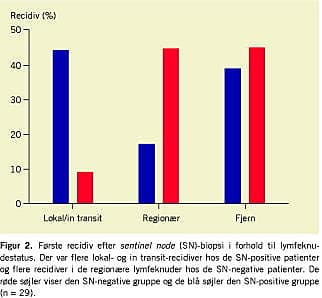 Det er endnu ikke klart, om der er en terapeutisk gevinst i form af øget overlevelse ved at gennemføre radikal lymfeknuderømning på SN-positive patienter. Dette undersøges i flere store, igangværende, prospektive og randomiserede undersøgelser med lang opfølgningstid [19, 20]. For de MM-patienter, som er subklinisk hæmatogent dissemineret på SNB-tidspunktet, kan der dog formentlig ikke opnås en væsentlig forbedret overlevelse, før effektiv systemisk behandling bliver tilgængelig [4]. Vi har i denne opgørelse fundet, at man med SNB-teknikken kan udpege en højrisikogruppe for både recidiv og mors inden for en kort årrække efter behandling af det primære MM. For såvel den SN-positive som den SN-negative gruppe fandt vi, at recidivtypen for 40-45% af patienterne var fjernmetastasering, som regel i form af organmetastasering (Figur 2). Dette kunne tilskrives, at disse recidiver skyldes subklinisk hæmatogen metastasering, som allerede er indtrådt på tidspunktet for behandlingen af primærtumor, og som derfor som ikke kan konstateres med SNB-teknik. Det bø