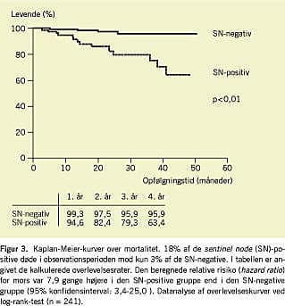 Mortaliteten var væsentlig højere hos de SN-positive patienter, idet 18% af de SN-positive patienter døde i opfølgningsperioden mod 3% af de SN-negative patienter (p < 0,01) (Figur 3). Den gennemsnitlige tid (mediantid) fra SNB til mors var 14 måneder (spændvidde 3-42 måneder). Af de fire dødsfald i den SN-negativ-gruppen var de tre på grund af metastaserende MM, mens et dødsfald var uden relation til MM. Hos de SN-positive var 12 af de 14 dødsfald forårsaget af MM, et dødsfald var ikke MM-relateret, og i et tilfælde kunne dødsårsagen ikke fastlægges med sikkerhed. Den MM-specifikke toårs og fireårsoverlevelse var henholdsvis 99% og 97% i den SN-negative gruppe mod henholdsvis 84% og 64% i den SN-positive gruppe.