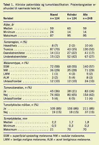 I fireårsperioden fra januar 2001 til december 2004 gennemgik 248 konsekutive MM-patienter: 124 mænd og 124 kvinder med en gennemsnitsalder på 59 år og en gennemsnitlig tumortykkelse på 1,8 mm, SNB på Plastikkirurgisk Afdeling, Roskilde Amts Sygehus Roskilde. Væsentlige patient- og tumorkarakteristika er angivet i Tabel 1 . Mænd og kvinder adskilte sig ikke væsentligt med hensyn til de angivne karakteristika bortset fra tumorplacering og tumortykkelse: kvinder havde som forventet flere MM på underekstremiteterne og mænd havde flere MM på truncus mens tumortykkelsen var mindre hos kvinder end hos mænd (p = 0,04) (Tabel 1).