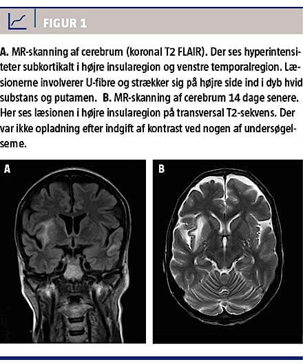 En MR-skanning af cerebrum viste på de T2-vægtede optagelser højsignalforandring i højre insula; diagnoseforslag var: »obs. encephalitis eller lavgradsgliom« (Figur 1). Spinalvæsken var normal og uden tumorceller. Den øvrige paraklinik var præget af lavt immunglobulin (Ig)A- og IgM-niveau på hhv. 0,16 g/l og < 0,10 g/l, mens IgG-niveauet var normalt. Det samlede leukocyttal var 4,14 mia./l og C-reaktivt protein-niveauet var < 0,6 mg/l.