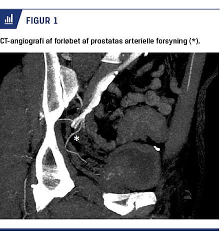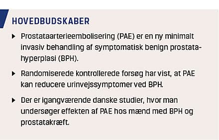 Endovaskulær embolisering varetages af interventionsradiologer flere steder i Danmark og har længe haft en central rolle i behandlingen af tumorer i urinvejene, f.eks. angiomylipomer i nyren [1]. Prostataarterieembolisering (PAE) som behandling af iatrogen blødning fra prostata efter nålebiopsi er beskrevet tilbage i 1970’erne [2]. I Danmark blev embolisering af prostata første gang beskrevet i 2015 hos en patient med benign prostatahyperplasi (BPH) og transfusionskrævende hæmaturi [3]. I 2000 beskrev en amerikansk gruppe succesfuld PAE hos en 76-årig mand, som havde BPH og recidiverende transfusionskrævende makroskopisk hæmaturi samt var uegnet til kirurgi [4]. Gruppen viste en 40% volumenreduktion af prostata efter 12 måneders opfølgning og en 46% reduktion af vandladningssymptomerne målt med International Prostate Symptom Score (IPSS) [4]. Siden har man i flere studier dokumenteret effekten af PAE som et minimalt invasivt alternativ til kirurgi i behandlingen af prostatalidelser [5-15].