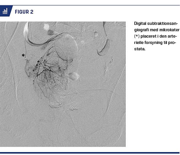 Arteriel adgang etableres ved punktur af arteria femoralis communis og anlæggelse af et indføringshylster, som herefter fungerer som adgangsport for kateterfremførelse (Seldingers teknik). Ved vanskeligt fremkommelig anatomi kan det være nødvendigt med punktur på begge sider, og alternativt kan en arterie i armen benyttes [19]. Digital subtraktionsangiografi (DSA) er en teknik, som gør det muligt kun at fremstille kontraststoffordelingen, og dermed visualiseres karanatomien i bækkenet. Ved hjælp af kontrastindsprøjtning og DSA styres guidewiren, og begge prostataarterier kateteriseres med et tyndt og fleksibelt kateter (Figur 2). Orientering gøres nemmere ved anlæggelse af et blærekateter med kontrastfyldt ballon, der virker som pejlemærke. Inden der administreres partikler, udføres der en cone-beam-CT (CBCT). Ved en CBCT fremstilles en tredimensional rekonstruktion af anatomien under kontrastindgift, hvilket sikrer korrekt kateterplacering i den arterielle forsyning til prostata uden forbindelse til de omkringliggende organer, herunder blære, rectum og penis [20]. Herefter kan prostataarterierne selektivt okkluderes ved håndinjicering af emboliseringspartikler. Der anbefales bilateral embolisering, som har en bedre effekt end en unilateral procedure, selvom unilateral embolisering medfører reduktion i symptomerne hos næsten halvdelen af patienterne [6]. Præoperativt gives der rutinemæssigt antibiotika intravenøst.