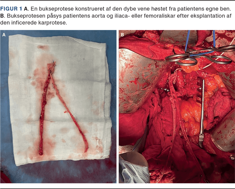 Kurativ behandling af VGEI i abdomen og bækkenet består traditionelt af operation med total eksplantation af den inficerede graft, débridement og kirurgisk rekonstruktion. Historisk var ekstraanatomisk rekonstruktion guldstandard for at nedsætte risikoen for recidiv, men in situ-rekonstruktion med autologt venemateriale har længe været anset som den foretrukne metode (Figur 1). Alternative graftmaterialer inkluderer bovine perikardiegrafter, kryopræserverede allografter eller antibiotikacoatede proteser, men man bør også overveje at dække karrekonstruktionen med biologisk materiale som f.eks. oment, fascie eller muskellapper. I tilfælde af fistel mellem aorta og andre organer behandles patienten i et tværfagligt samarbejde med parenkymkirurger, hvor fistlen i udgangspunktet forsøges lukket [3]. Partiel eksplantation indebærer delvis fjernelse af den inficerede graft. Denne tilgang bør tages i betragtning, når total eksplantation anses for at være for risikabel grundet anatomisk kompleksitet og/eller patientens komorbiditeter. Nogle studier har vist, at denne strategi er forbundet med en højere risiko for infektionsrecidiv, mens andre indikerer, at overlevelsen ved graftbevarende semikonservativ behandling med débridement og/eller perkutan drænage med eller uden partiel graftresektion er sammenlignelig med radikal grafteksplantation [18].
