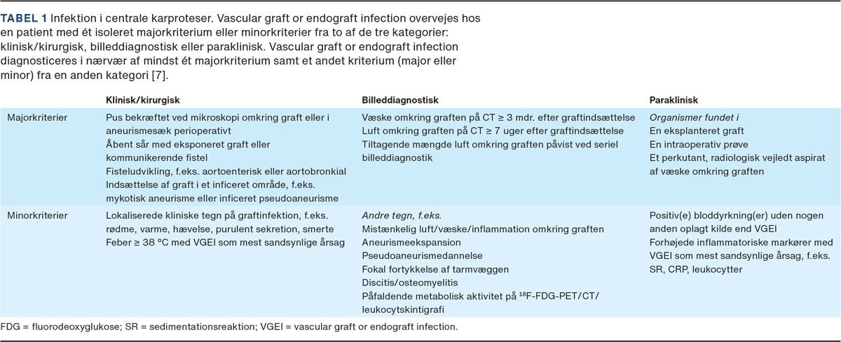 - Diagnosen VGEI er multimodal og involverer tværfaglig ekspertise, og diagnosen bør derfor stilles i et multidisciplinært team (MDT)-samarbejde, der inkluderer infektionsmedicinere, karkirurger, thoraxkirurger, kliniske mikrobiologer, radiologer, nuklearmedicinere og evt. parenkymkirurger ved fistulering [3]. Diagnostikken tager afsæt i Management of Aortic Graft Infection Collaboration (MAGIC)-kriterierne [6, 7]. Kriterierne er opdelt i tre kategorier: kliniske/operative, billeddiagnostiske og parakliniske fund (Tabel 1). Hver kategori omfatter flere major- og minorkriterier. VGEI overvejes ved opfyldelse af ét majorkriterium eller ved opfyldelse af ≥ 2 minorkriterier fra to forskellige kategorier, mens VGEI diagnosticeres ved opfyldelse af ét isoleret majorkriterium og ≥ 1 minor- eller majorkriterier fra en hvilken som helst anden kategori.