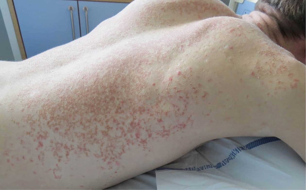 En 27-årig mand blev henvist til hudlæge, da han havde haft et kløende udslæt på kroppen gennem flere uger. Han fremviste et retikulært, stedvist let skællende, rødbrunt udslæt på krop, hals/nakke og de proksimale ekstremiteter. Flere hudstansebiopsier viste spongiøs dermatitis, som det kan ses ved eksem. Der var nekrose af enkelte keratinocytter og i den seneste biopsi var der også follikulitis. Udslættet responderede ikke på behandling med potent lokalsteroid.