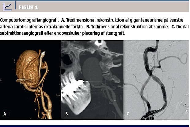 En magnetisk resonans (MR)-skanning ti dage efter bilateral tonsillektomi viste PA på venstre carotis interna, hvorefter patienten blev overflyttet til et tertiært sygehus. En computertomografiangiografi (CTA) viste et ekstrakranialt gigantaneurisme på 30 × 28 × 42 mm på venstre carotis interna under basis cranii (Figur 1). Aneurismet var ikke tilgængeligt for åben kirurgi, hvorfor der blev foretaget endovaskulær behandling.