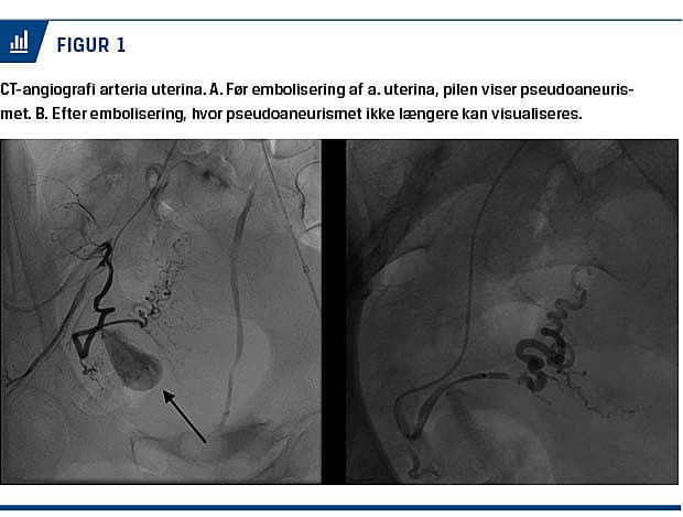 En uge senere blev kvinden genindlagt med fornyet kraftig vaginalblødning. Ved en ultrasonisk undersøgelse fandt man et lille hulrum på 2 × 2 cm med pulserende kar på den cervikokorporale overgang, og der var mistanke om et pseudoaneurisme i højre a. uterina. Diagnosen blev verificeret ved CT-angiografi (Figur 1). Hun blev overflyttet til en billeddiagnostisk afdeling, hvor a. uterina blev emboliseret på begge sider af pseudoaneurismet. Efterfølgende kunne pseudoanurismet ikke længere visualiseres, og blødning samt smerter ophørte.