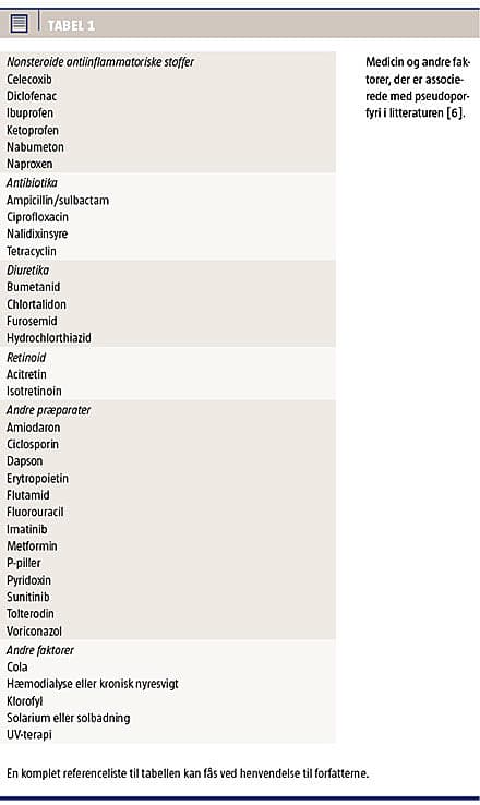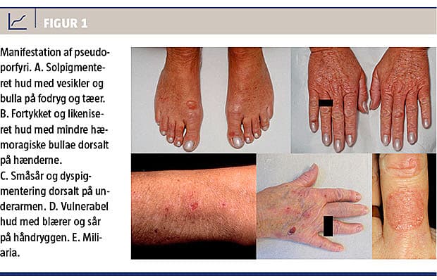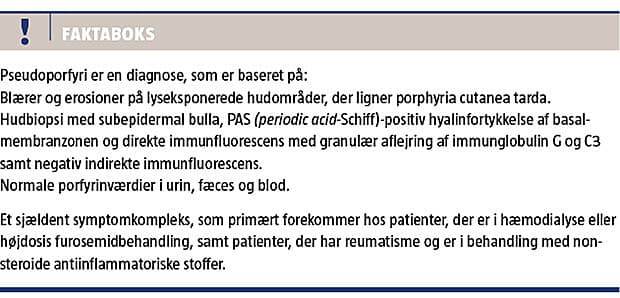 Pseudoporfyri blev første gang beskrevet i 1975 hos fem patienter, der havde kronisk nyresvigt og fik et lyslokaliseret vesikobulløst udslæt uden biokemiske tegn på porphyria cutanea tarda [1]. Siden har der været publiceret mange artikler om pseudoporfyri udløst af forskellige medikamenter og sol-/solariumeksponering.