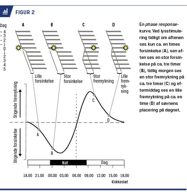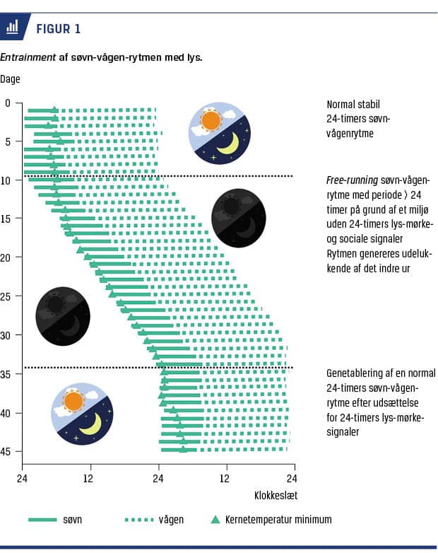 Kronobiologi er læren om primært cirkadiske rytmer i det biologiske system med en periode på ca. 24 timer. Entrainment beskriver, hvordan et regelmæssigt eksternt stimulus fra en såkaldt zeitgeber justerer døgnrytmen til 24 timer (Figur 1). Lys fungerer som den vigtigste zeitgeber, der via retinale receptorer til hjernens biologiske ur i nucleus suprachiasmaticus (SCN) opretholder en stabil 24-timers søvn-vågen-rytme. Et lyssignal om morgenen medfører en fremrykning af søvnen til tidligere på døgnet, mens lys om aftenen medfører en forsinkelse af søvnen til senere på døgnet (Figur 2). Andre vigtige zeitgebers er social kontakt, spisning og motion, som på lignende måde har forskellige effekt på døgnrytmen afhængig af tidspunktet for stimulering. Ved fravær af zeitgebers, dvs. under isolation og svagt lys, vil søvn-vågen-rytmen have en periodelængde på ca. 24,2 timer og således drive til senere på døgnet. Næsten alle kroppens celler, inklusive kortikale neuroner, har klokkegener. Disse har behov for tidsgiversignaler fra SCN for at sikre et orkestreret samspil af organfunktionerne. Et dertil knyttet klinisk begreb er kronotype, der angiver en persons præferencer for aktivitet gennem døgnet (A- og B-mennesker). Kronoterapi er behandling, der er baseret på korrektion af døgnrytmen og den sæsonbetingede rytme. Sæsonbetingede ændringer i søvn, social funktion, humør, appetit og energi kan vurderes med Seasonal Pattern Assessment Questionnaire (SPAQ).