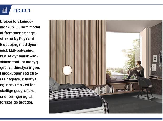 I forbindelse med planlægningen af Ny Psykiatri Bispebjerg planlægges der med dynamisk kunstlys. For at kvalificere dette er der bygget en drejelig 1:1-nøjagtig kopi af en sengestue (Figur 3), hvor dagslys og kunstlys kan måles, hvorved den samlede belysning kan optimeres. Det må dog understreges, at den nuværende evidens for en antidepressiv effekt af dynamisk belysning hos indlagte patienter med depression er spinkel.