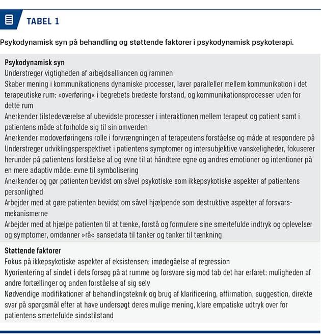 Psykodynamiske teorier og holdninger i læge-patient-forholdet har en lang historie inden for flere lægelige specialer [1-5] og spillede i flere årtier en væsentlig rolle i psykiatrisk diagnostik og behandling for såvel indlagte som ambulante patienter [6-10]. Behandlingen havde fokus på patientens personlighedsstruktur, og maladaptive gentagelsesmønstre fra patientens
