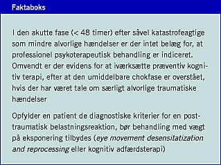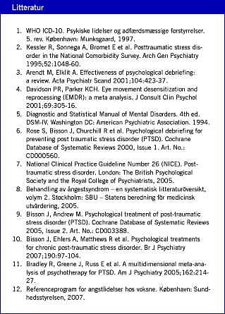 Summary Psychological debriefing Ugeskr Læger 2009;171(8):607-610 Diagnostic criteria for stress reactions and adjustment disorders are summarized. Existing psychological treatments are outlined with a focus on evidence-based methods, and recommendations for treatment are described. The conclusion is that there is no evidence for the effect of psychological debriefing or other professional treatment in the immediate aftermath of traumatic events. On the other hand, cognitive behavioural therapy, EMDR and similar methods with focus on exposure can be recommended, both as a preventive strategy and for patients with post-traumatic stress disorder.