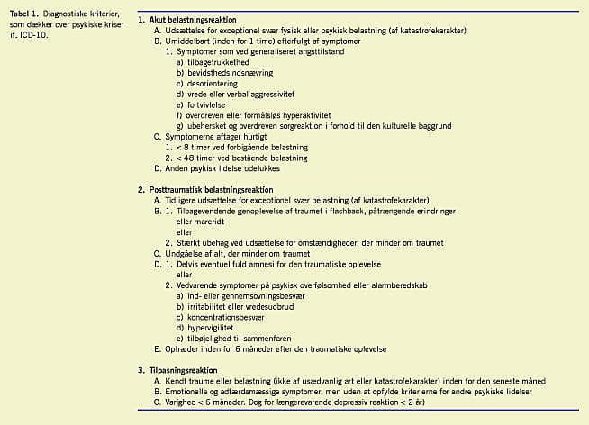 I den 10. udgave af WHO's internationale sygdomsklassifikation, International Classification of Diseases (ICD) [1] er der tre diagnoser, som dækker over psykiske kriser eller mere præcist »reaktioner på svær belastning og tilpasningsreaktioner« (Tabel 1): 1) akut belastningsreaktion (F43.0), 2) posttraumatisk belastningsreaktion (F43.1) og 3) tilpasningsreaktion (F43.2). De to førstnævnte diagnoser kan kun stilles hos personer, som har været udsat for »exceptionel svær fysisk eller psykisk belastning (af katastrofekarakter)« [1]. Katastrofer såsom tsunamien i Thailand i 2004 eller færgen Estonias forlis er evidente eksempler herpå, men talrige andre belastninger i dagligdagen kan have katastrofekarakter for det enkelte menneske, f.eks. voldsomme trafikulykker, bankrøverier, overfald og voldtægter.