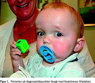Da han var ti måneder gammel, blev patienten set i børneneurologisk regi pga. forsinket udvikling svarende til seks måneder. Man fandt hypotoni, stort hovedomfang (+ 3 standardafvigelser (SA)) med frontal bossing, hypertelorisme, kort nakke med nedsat bevægelighed og forhornede områder under tåneglene (Figur 1 ). Røntgen af columna viste osteo-sklerotiske knogler, barnet blev umiddelbart herefter indlagt til yderligere udredning. Ved indlæggelsen var han bleg og havde højresidig facialisparese under gråd. Røntgen af hele skelettet viste osteosklerotiske knogler. Magnetisk resonans-skanning viste hydrocefalus, aquaduktstenose, snævert foramen magnum men normalt udseende parenkym. Paraklinisk fandtes anæmi (Hb 5,4) og trombocytopeni (133). Ca++ og 25-OH-vitamin-D var normal, men parathyroideahormon og 1,25-OH-vitamin-D var markant forhøjede som reaktion på den nedsatte Ca-frigivelse fra knoglerne. Dual energy X-ray absorptiometry -skanning viste markant forhøjet knogletæthed (+ 3 SA). Øjenlæge påviste begyndende opticus atrofi, ørelæge påviste serøs otitis media, men normal hørelse. Barnet blev undersøgt for kendte genetiske mutationer, uden at sådanne blev fundet.