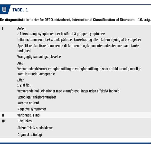 De diagnostiske kriterier for skizofreni i det i Danmark anvendte ICD-10 vises i Tabel 1. Selv om man i introduktionen til ICD-10 understreger, at disse kriterier afgrænser diagnosen (gatekeepere), betragtes de ofte som det udtømmende kliniske billede. Vi kan pege på følgende problemer ved ICD-10’s skizofrenidiagnose: diagnosen fremhæver psykotiske symptomer i form af vrangforestillinger og hallucinationer [11], således at muligheden for diagnostik af desorganiserede skizofreniformer (hebefreni) næsten ikke er til stede, og hebefrenidiagnosen praktisk taget ikke forekommer hos førstegangsindlagte patienter [3]. Desuden er symptomerne defineret med en meget høj sværhedsgrad; formelle tankeforstyrrelser defineres f.eks. som neologismer og inkohærens, som praktisk talt kun ses hos meget kronisk syge patienter.