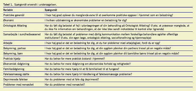 Data vedr. psykosociale problemer omfatter problemer med praktiske gøremål, økonomi, planlægning af behandling på onkologisk afdeling, samarbejde inden for sundhedsvæsenet og mellem sundheds- og socialvæsenet, bekymring for partner og bekymring for børn. Disse variable blev målt ved enkeltspørgsmål til den oplevede belastning ved det pågældende problem. Behov for yderligere hjælp blev målt ved fire enkeltspørgsmål inden for områderne praktisk hjælp, økonomisk rådgivning, familier ådgivning og følelsesmæssig støtte. Til alle spørgsmål fandtes svarmuligheder fra »slet ikke« til »meget« på en 5-punkts Likert-skala (Tabel 1).