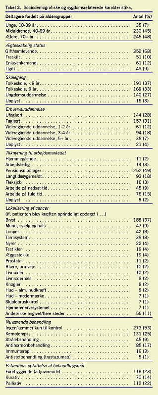 Den undersøgte population bestående af 71% af de tilgængelige patienter, som mødte til undersøgelse på Onkologisk Afdeling, Århus Sygehus, i løbet af en uge, omfattede en ligelig fordeling af patienter i aktiv behandling og patienter, der blot kom til kontrol, og af nydiagnosticerede patienter og patienter med et længere sygdomsforløb. Deltagerne omfattede to tredjedele kvinder og en tredjedel mænd, og aldersmæssigt dækkede gruppen 18-90 år. I betragtning af den tilfredsstillende deltagelsesprocent må deltagergruppens bredde i sygdoms- og sociodemografiske karakteristika antages at afspejle den typiske variation i den patientgruppe, som dagligt møder til undersøgelse og behandling på en onkologisk afdeling.